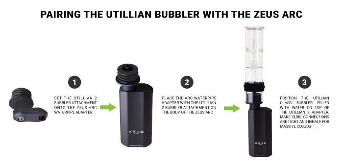 The Utillian Glass Bubbler can also fit on any Arc series device with the added Zeus Arc Waterpipe Adapter simply by following the steps depicted in the graphic above.